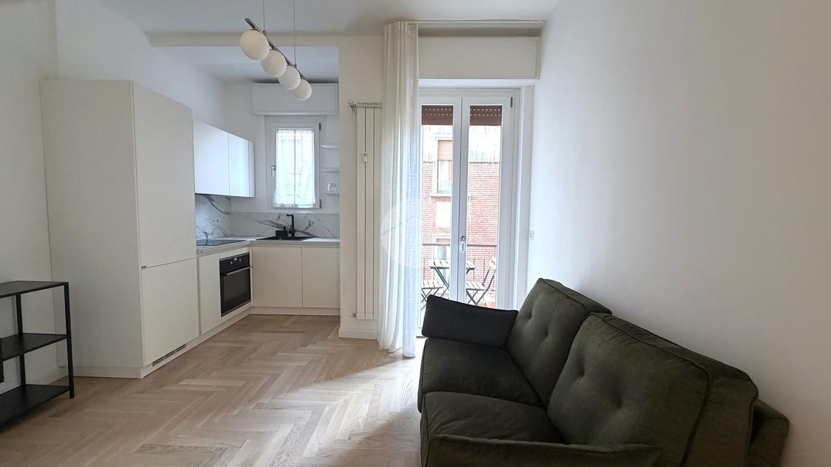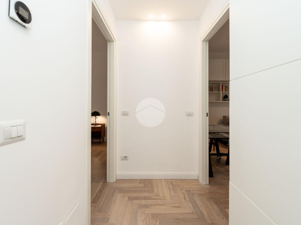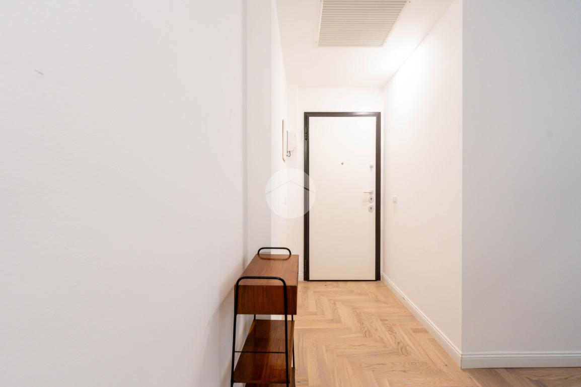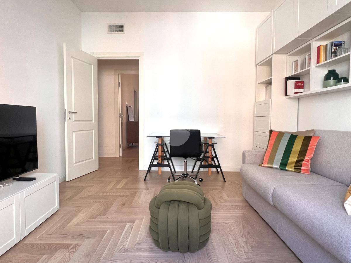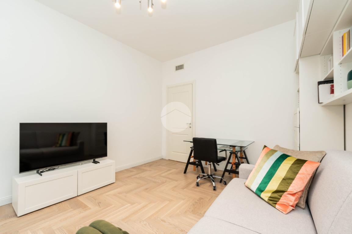 L’appartamento, completamente ristrutturato, accoglie con un ampio ingresso che conduce a una luminosa zona living, vero cuore della casa. La cucina a vista, realizzata su misura, si integra perfettamente con l’ambiente e si apre su un balcone con affaccio interno, ideale per godere di tranquillità e privacy pur restando nel pieno della città.
